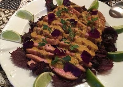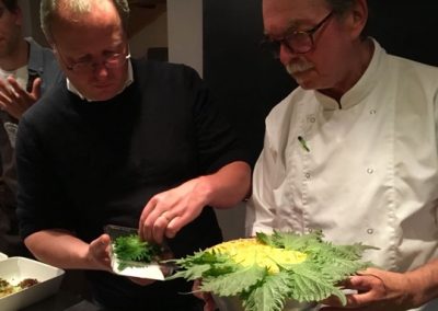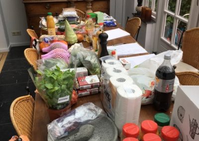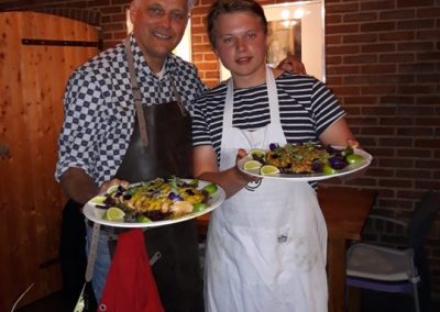 Na ruim 40 jaar weer contact met mijn familie uit Bunde. Fantastisch! Meteen vertaald naar een kookworkshop-reunie-kennismaking. In kookstudio “de Riet”. Een aanrader. Zeker voor herhaling vatbaar. Hard gewerkt, ook wat geleerd, heerlijk gegeten, volop genoten. Na de gezamenlijke bereiding van de basisbumbu Base Gede en voorbereiding van de Nasi Goreng Kuning, in 7 duo’s aan de slag met Kenus Mebase Bali – babyinktvisjes op z’n Balinees, Bebek Kuning – eend in ‘t geel, Be Sampi Bebotok – gehakt-kokos-“brood”, Telor Puyuh Base Lalah – nestje pittige kwarteleieren, Jukut Jepang – chayote in een kruidige saus van Base Megenep, Sambal Bajak – aromatische sambal, Sambal Matah – verse “rauwe” sambal, Acar Ketimun – zoetzuur van komkommer en Acar Mangga – zoetzuur van mango. Kortom een feest van geuren, kleuren en smaken in een rijsttafel rondom een Tumpeng Nasi Goreng Kuning.